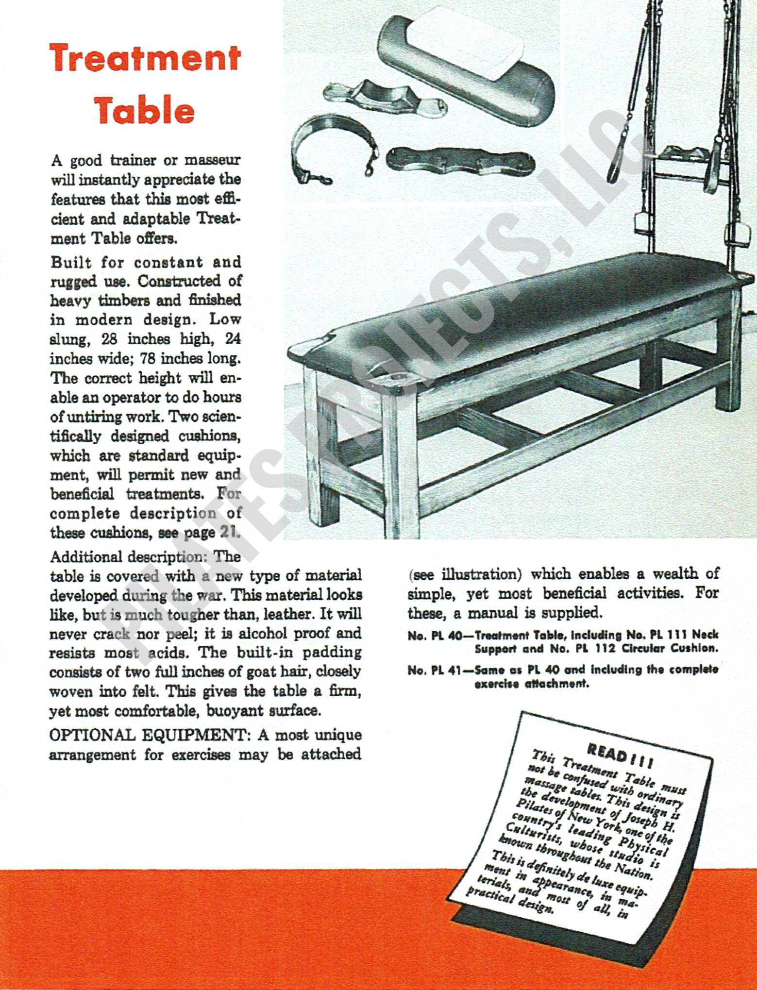 In small print, this advertisement in the Atlas catalogue noted that “This Treatment Table must not be confused with ordinary massage tables. This design is the development of Joseph H. Pilates of New York, one of the country’s leading Physical Culturists, whose studio is known throughout the Nation”. Additional accessories were also listed for sale. This is an 8×10 glossy photo featuring red accents. Postage is included in the cost.